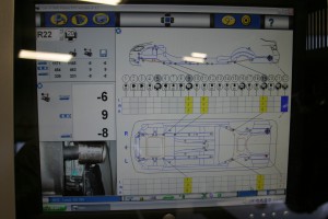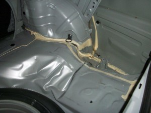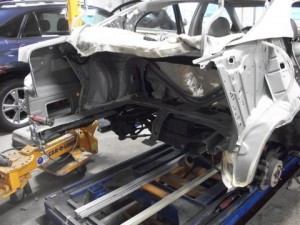 We disassembled the car to assess all damage and prepare an estimate for the insurance company. The trunk lid, trunk floor, bumper, right and left quarter panel and the unibody frame extension were all badly damaged in the accident. Once the repairs were approved by the insurance company, we ordered all the original equipment Lexus bumper parts. Next stop was the frame machine where we used our computerized Car-O-Liner 3D measuring system to evaluate the severity of the damage. With this equipment we can make corrective pulls to return the outer body panels and unibody back to the original factory specifications. After all the necessary unibody frame pulls were completed, it was time to cut the old/damaged panels off the car. In this case we removed the entire Trunk floor, right unibody frame rail, and right quarter panel.